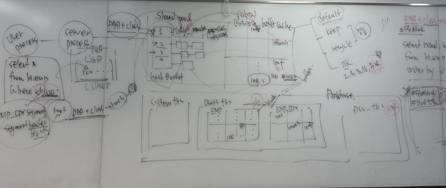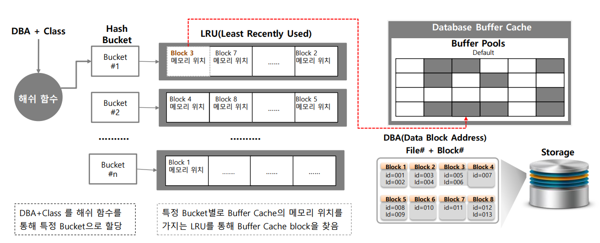 실행계획을 통해서 요청한 블록의 DBA(Data Block Address)와 Block class(종류)에 대해 shared pool의 해시함수에 적용한 결과를 이용해서 hash bucket을 찾는다.