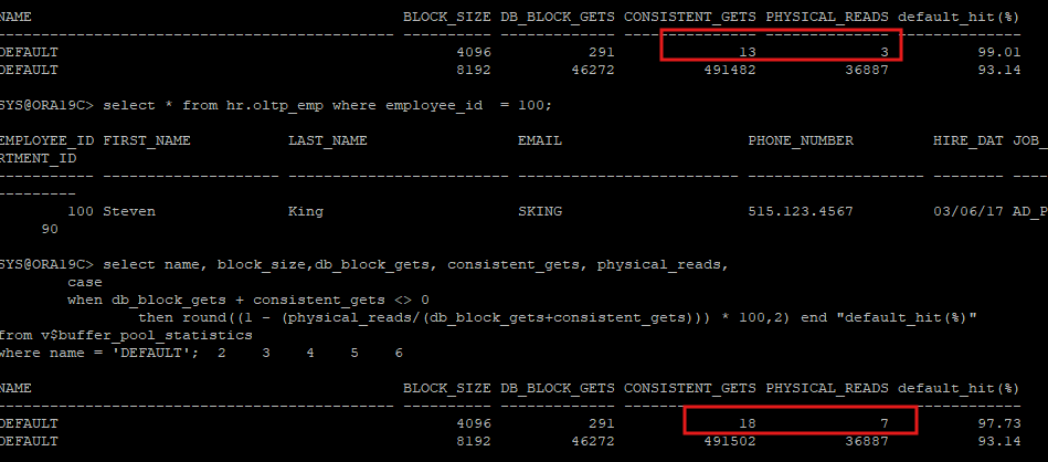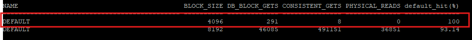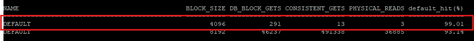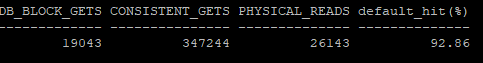 then round((1 - (physical_reads/(db_block_gets+consistent_gets))) * 100,2) end "default_hit(%)"