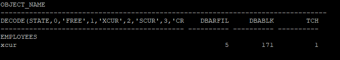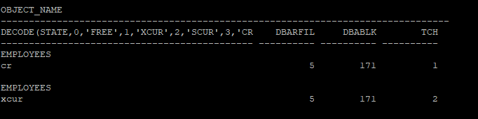 select o.object_name, decode(state,0,'free',1,'xcur',2,'scur',3,'cr'), dbarfil, dbablk, tch