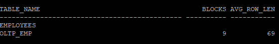 select table_name,blocks, avg_row_len from dba_tables where owner='HR' and table_name in ('EMPLOYEES','OLTP_EMP');