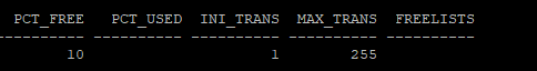 select pct_free,pct_used, ini_trans, max_trans, freelists from dba_tables where owner='HR' and table_name='EMPLOYEES';