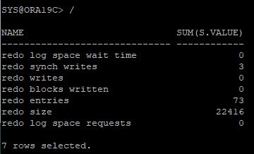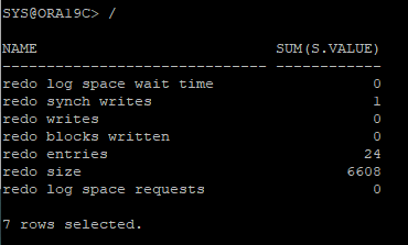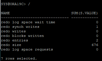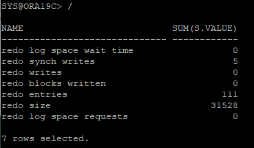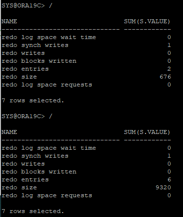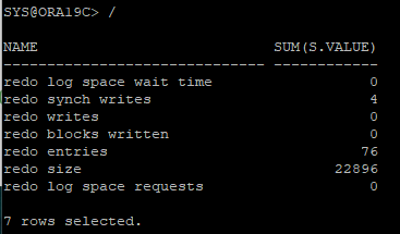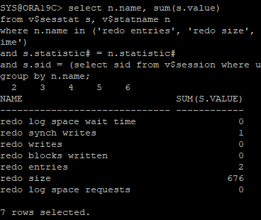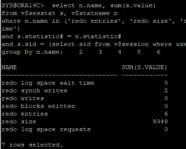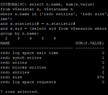 where n.name in ('redo entries', 'redo size', 'redo synch writes', 'redo writes', 'redo blocks written', 'redo log space requests', 'redo log space wait time')