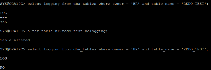 select logging from dba_tables where owner = 'HR' and table_name = 'REDO_TEST';alter table hr.redo_test nologging;alter table hr.redo_test logging;