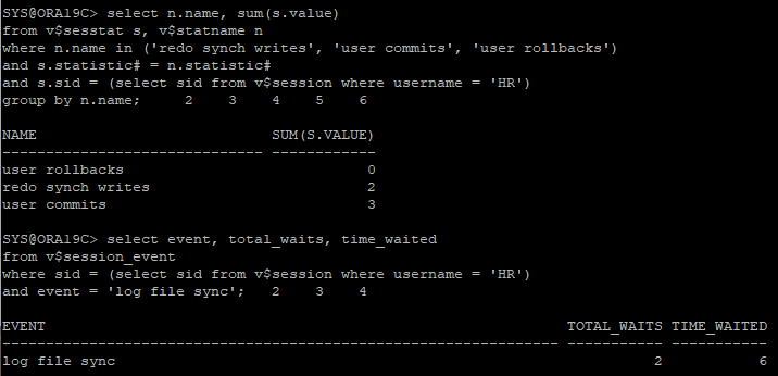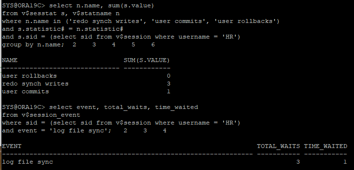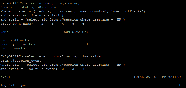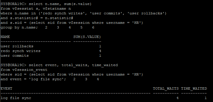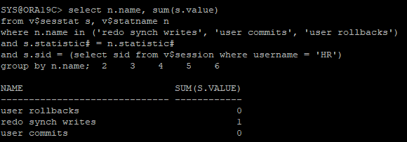 where n.name in ('redo synch writes', 'user commits', 'user rollbacks')