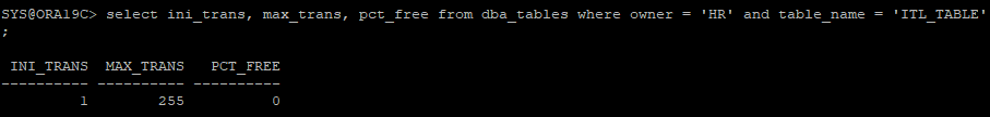 select ini_trans, max_trans, pct_free from dba_tables where owner = 'HR' and table_name = 'ITL_TABLE';
