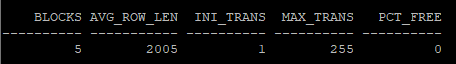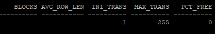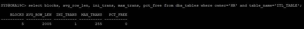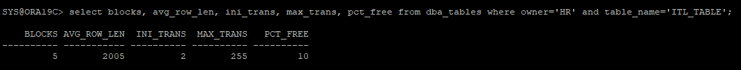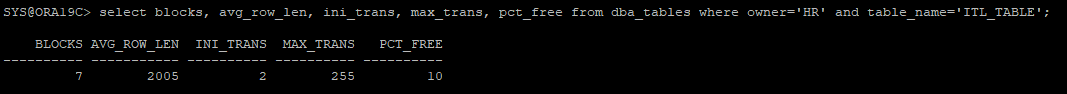 select blocks, avg_row_len, ini_trans, max_trans, pct_free from dba_tables where owner='HR' and table_name='ITL_TABLE';