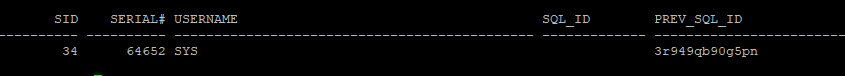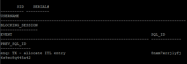 select sid, serial#, username, blocking_session, event, sql_id, prev_sql_id