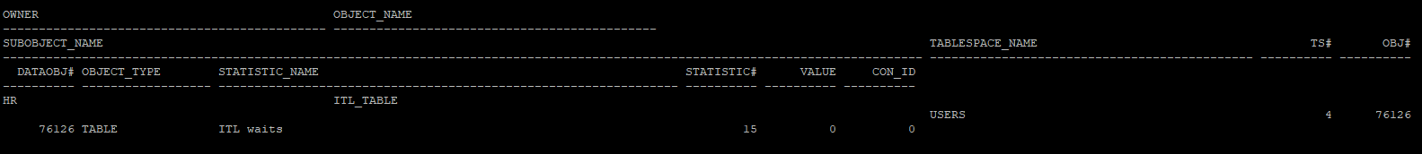 select * from v$segment_statistics where owner='HR' and statistic_name='ITL waits';