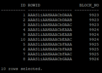 select id, rowid, dbms_rowid.rowid_block_number(rowid) block_no