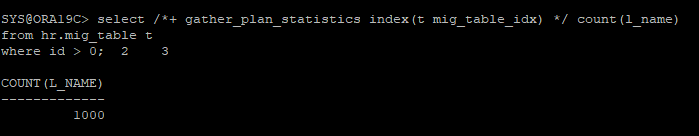 select /*+ gather_plan_statistics index(t mig_table_idx) */ count(l_name)