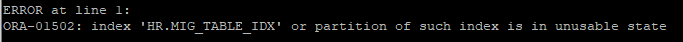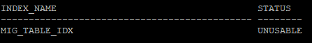 select index_name, status from dba_indexes where owner='HR' and table_name='MIG_TABLE';
