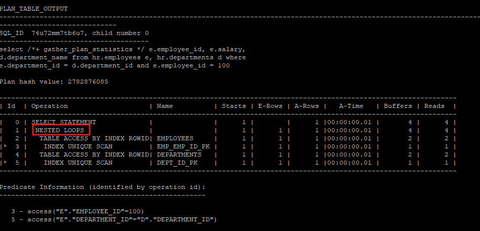 |* 5 | INDEX UNIQUE SCAN | DEPT_ID_PK | 2 | 1 | 2 |00:00:00.01 | 2 |