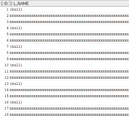 다음으로, 데이터를 삽입합니다. level을 사용하여 1000개의 행을 삽입하며, 행의 크기를 2000 바이트로 맞춥니다. 일부는 NULL로 설정되며, rpad('x', 2000, 'x')을 사용해 각 행의 길이를 2000자로 고정합니다.