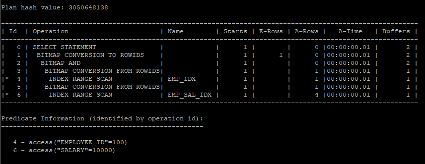 select /*+ gather_plan_statistics index_combine(e emp_idx emp_sal_idx) */ employee_id, salary
