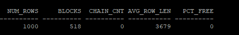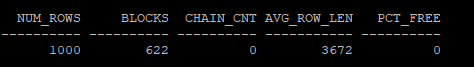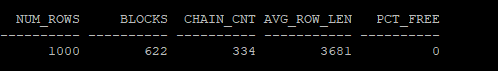 select num_rows, blocks, chain_cnt,avg_row_len,pct_free from dba_tables where owner='HR' and table_name = 'MIG_TABLE';