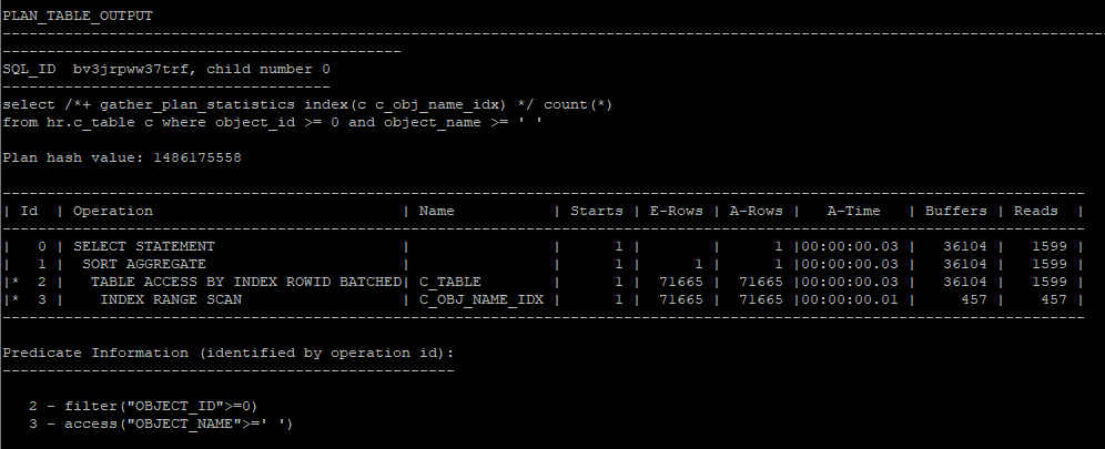 select /*+ gather_plan_statistics index(c c_obj_name_idx) */ count(*)