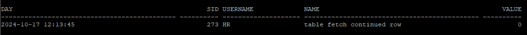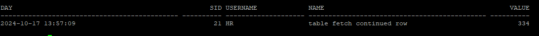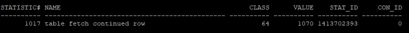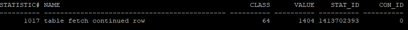 이 단계에서 Row Migration이 발생했는지 확인하려면, table fetch continued row 통계값을 확인해야 합니다. v$sysstat 뷰를 통해 이를 조회할 수 있습니다.