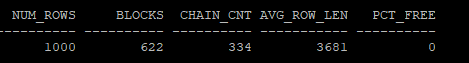 이후 다시 통계 정보를 조회하여 CHAIN_CNT(Row Chaining 또는 Row Migration이 발생한 행의 수)를 확인합니다.