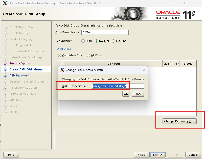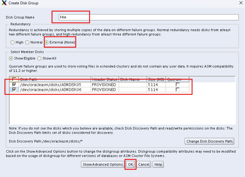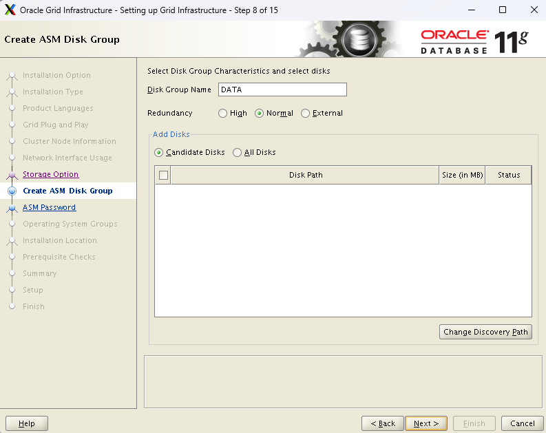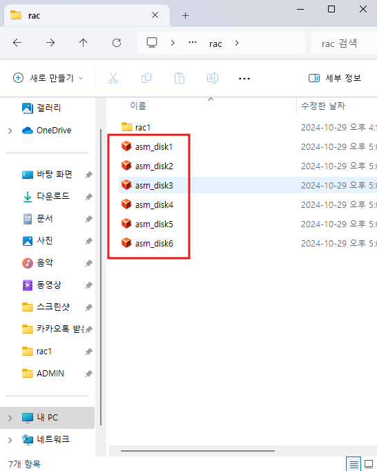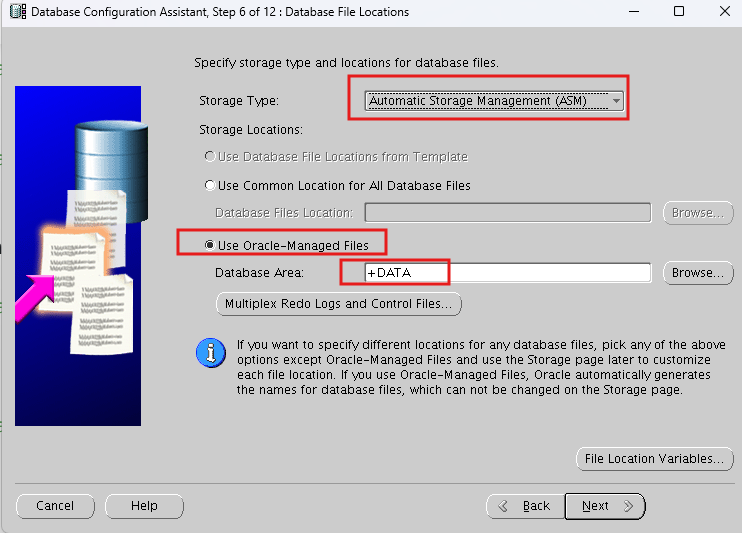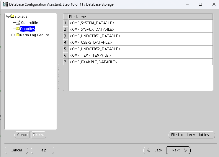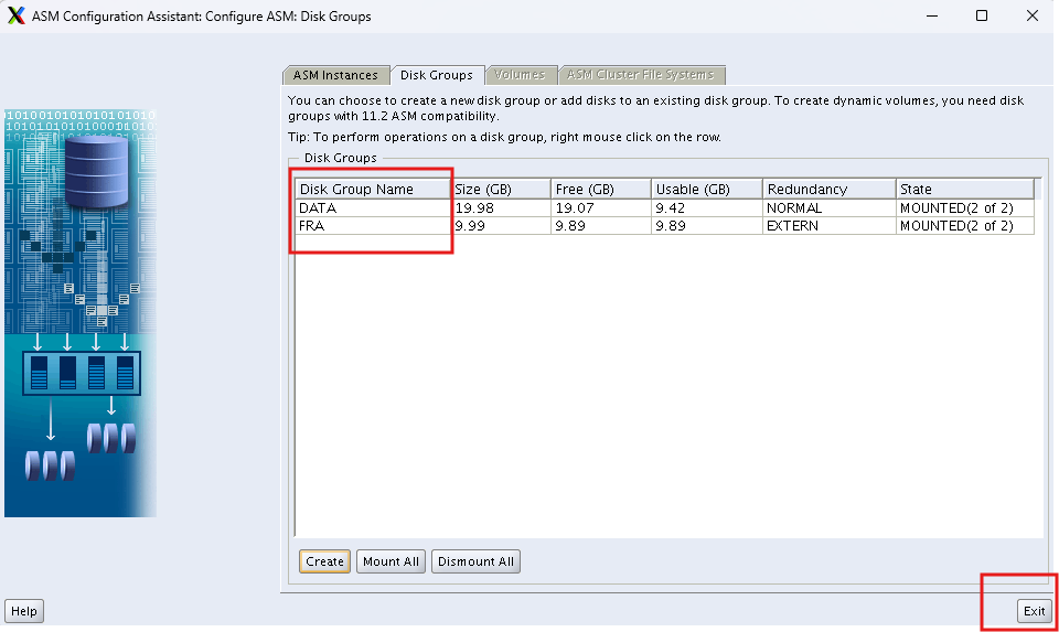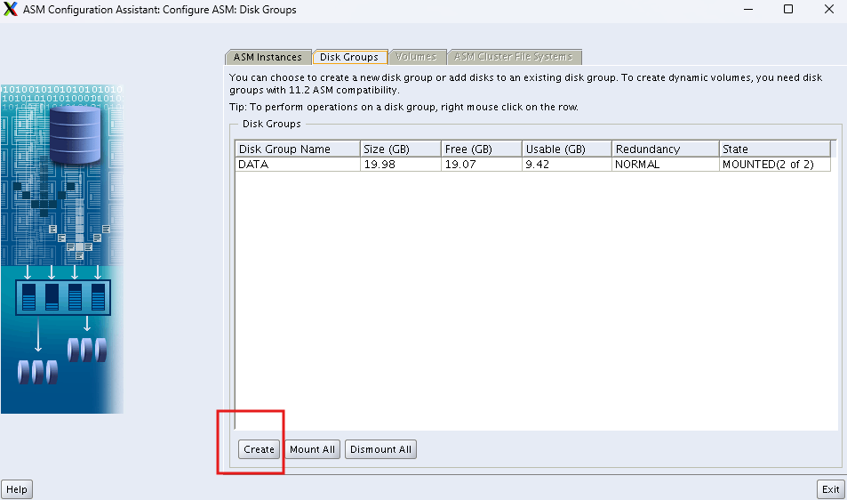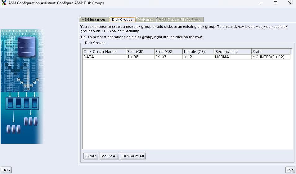 필수 데이터파일(sys, sysaux, undo, temp, user) 와 redo 파일이 DATA디스크 그룹에 만들어진다.