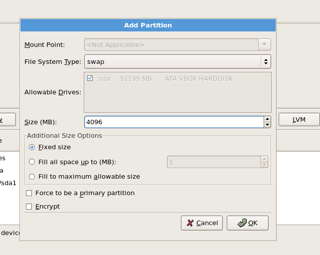 다시 NEW들어가서 Mount Point는 놔두고 파일시스템 타입을 swap 공간으로 설정하고 size는 4096로 변경(4GB로 한건 보편적으로 메모리의 2배수, 메모리 부족할때 스왑공간을 메모리처럼 사용한다)