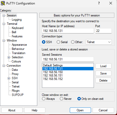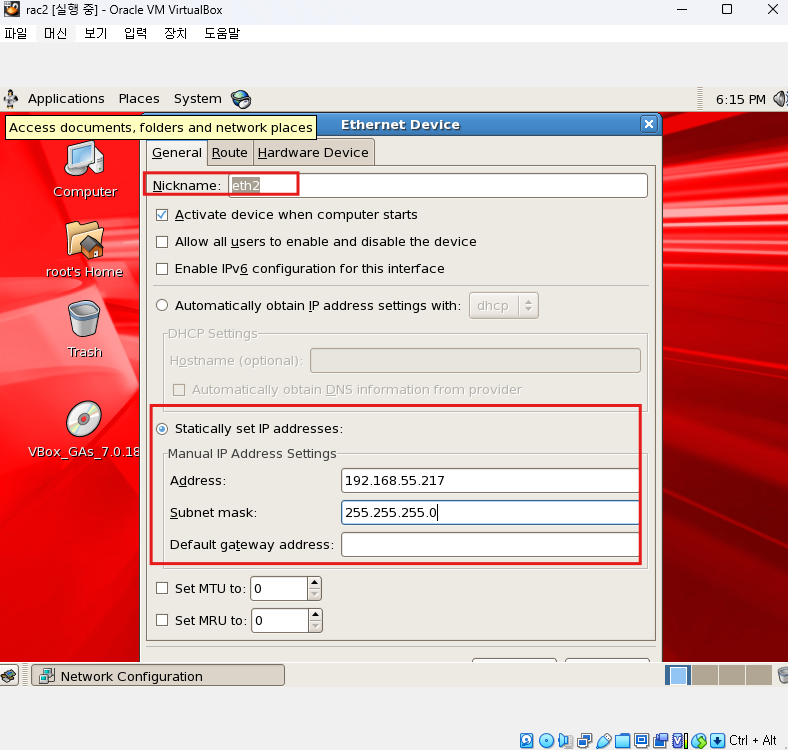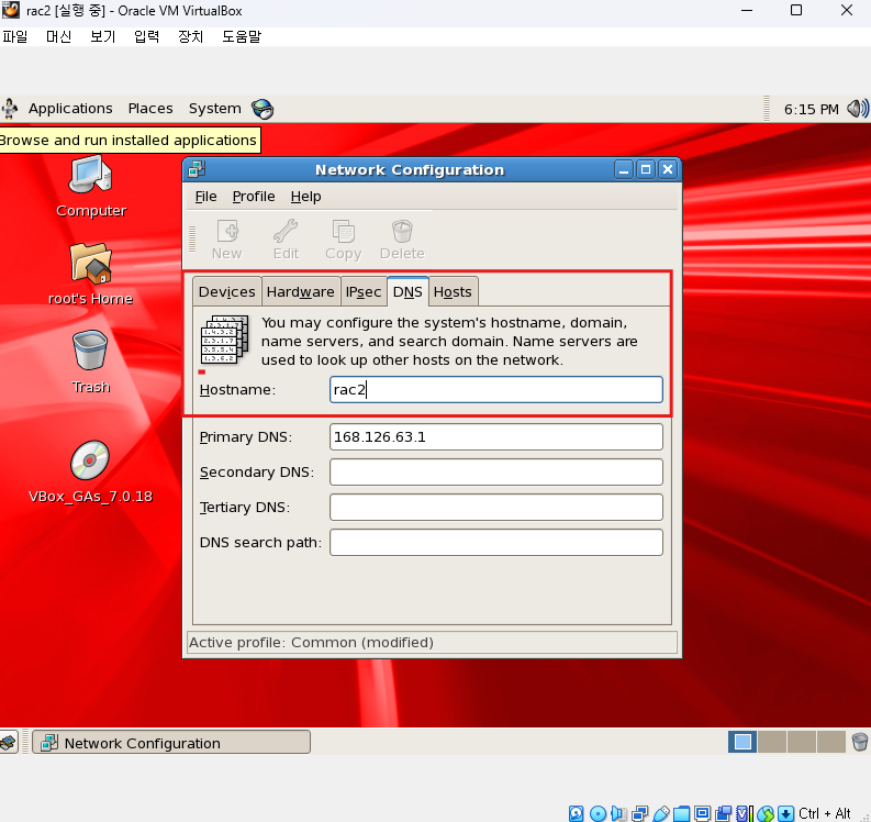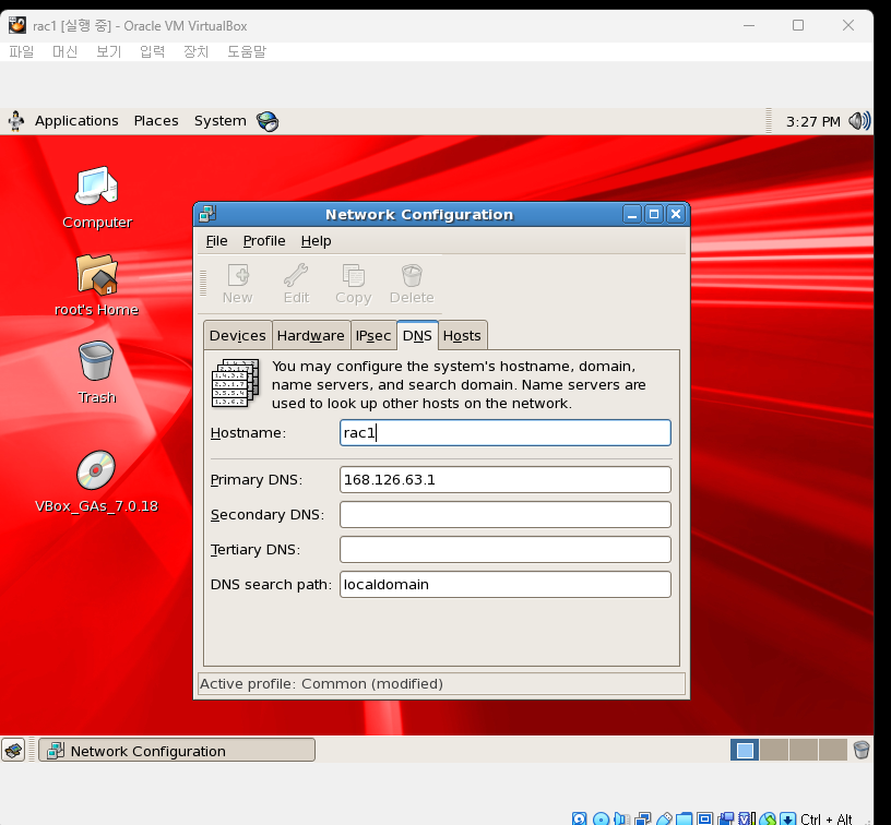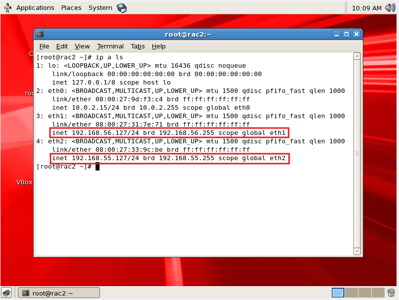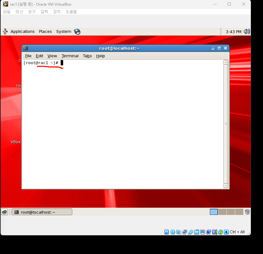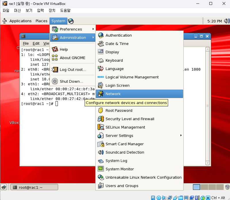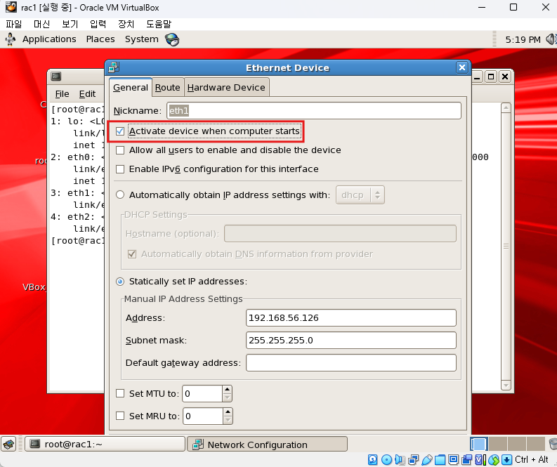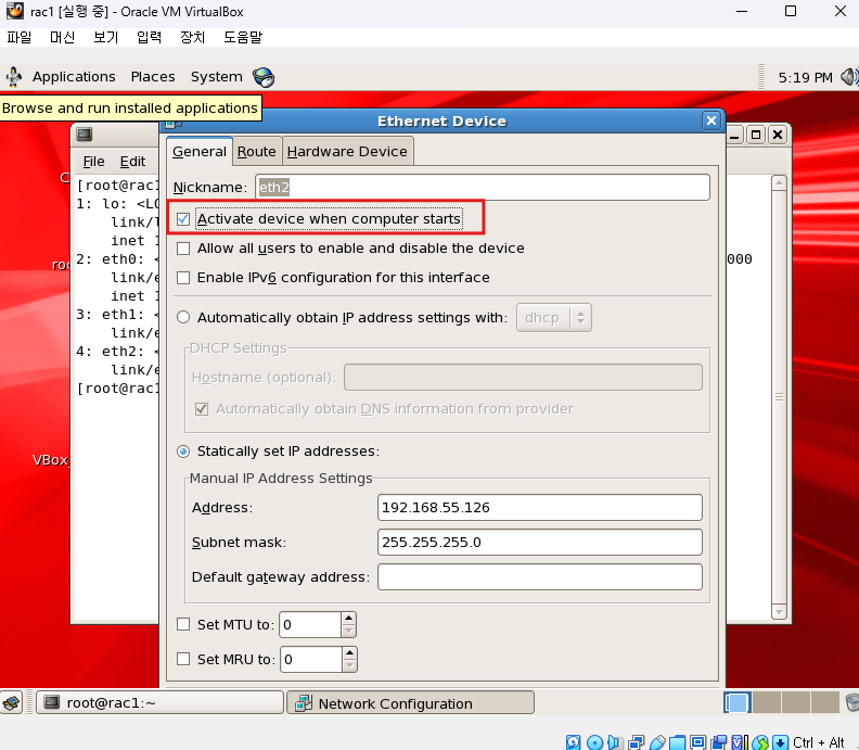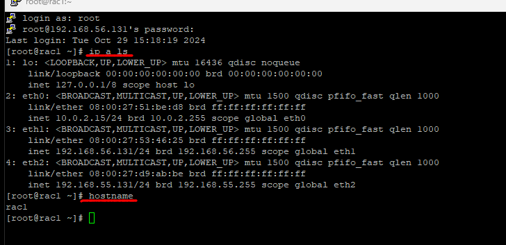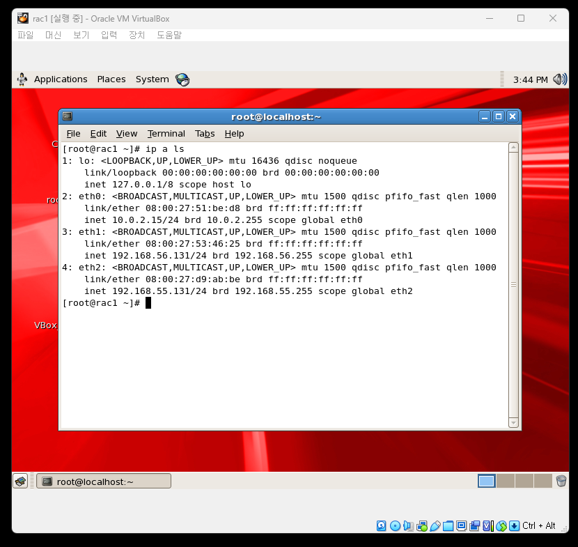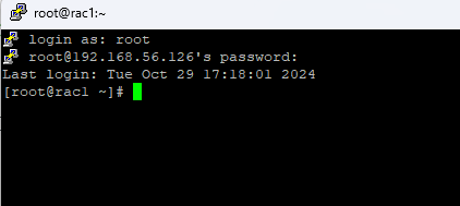 putty를 통해 rac1 서버로 접속 후 ip주소, hostname 확인