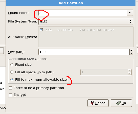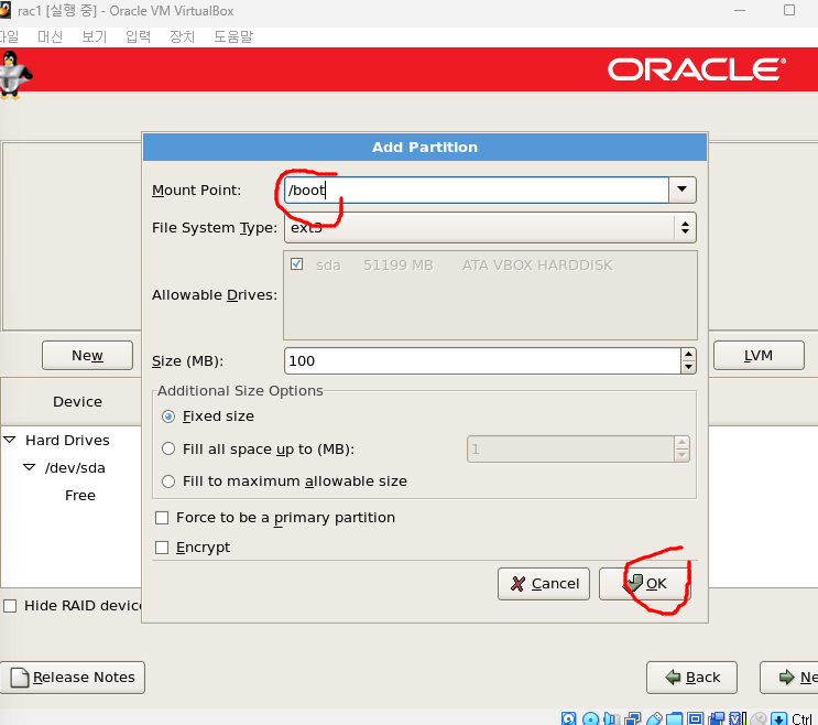 다시 NEW들어가서 Mount Point /로 나머지 공간은 루트 디렉토리가 사용할 수 있도록 fill to~ 클릭
