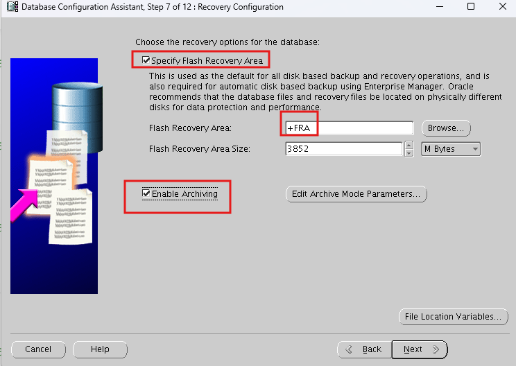 flash recovery area로 아까 생성한 FRA 디스크 그룹을 사용한다.