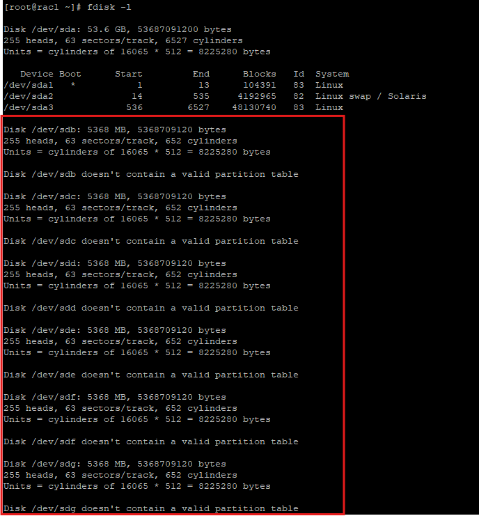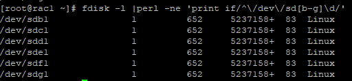 [root@rac1 ~]# fdisk -l |perl -ne 'print if/^\/dev\/sd[b-g]\d/'