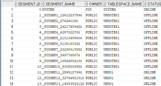 SELECT segment_id, segment_name, owner, tablespace_name, status