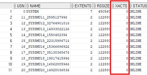 - rssize는 undo segment의 사이즈, xacts는 해당 세그먼트에 연결된 트랜잭션 갯수
