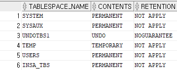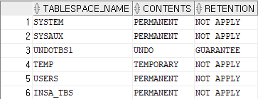 SELECT tablespace_name, contents, retention FROM dba_tablespaces;