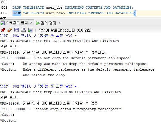 - DEFAULT TABLESPACE와 DEFAULT TEMPORARY TABLESPACE 를 삭제하려고 하면 오류가 발생한다.