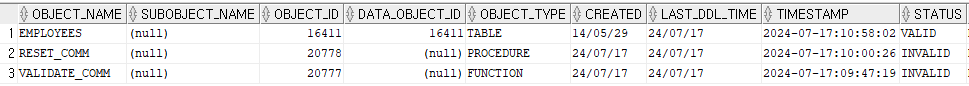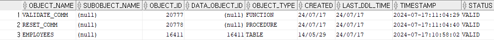 SELECT * FROM user_objects WHERE object_name IN ('EMPLOYEES','VALIDATE_COMM', 'RESET_COMM');