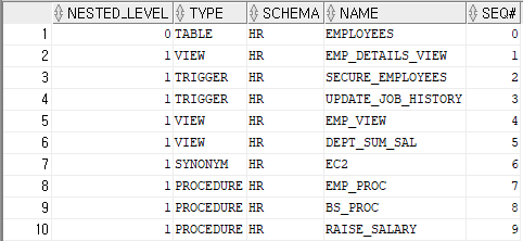 SELECT * FROM user_dependencies WHERE referenced_name IN ('EMPLOYEES','VALIDATE_COMM', 'RESET_COMM');