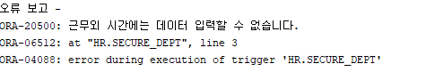 RAISE_APPLICATION_ERROR(-20500, '근무외 시간에는 데이터 입력할 수 없습니다.'); -- hr.dept 에서 암시적으로 작동한다.