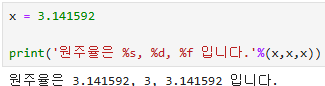 print('원주율은 %s, %d, %f 입니다.'%(x,x,x))