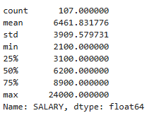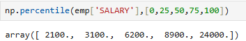 np.percentile(emp['SALARY'],[0,25,50,75,100])