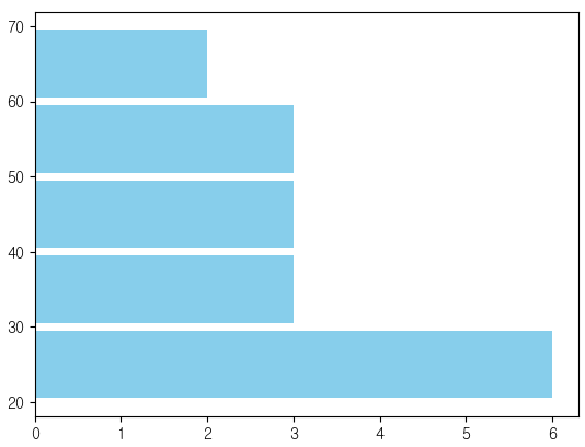 plt.hist(ages,bins=bins,rwidth=0.9,orientation='horizontal',color='skyblue')