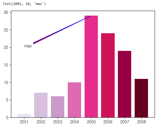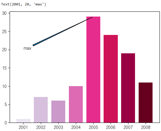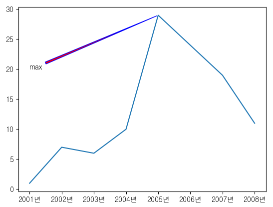 plt.annotate(text='max', xy=(2005,29),xytext=(2001,20),arrowprops={'arrowstyle':'wedge'})