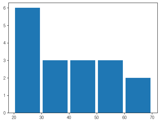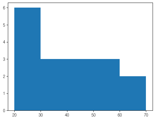 bins = [20, 30, 40, 50, 60, 70] # 구간의 경계