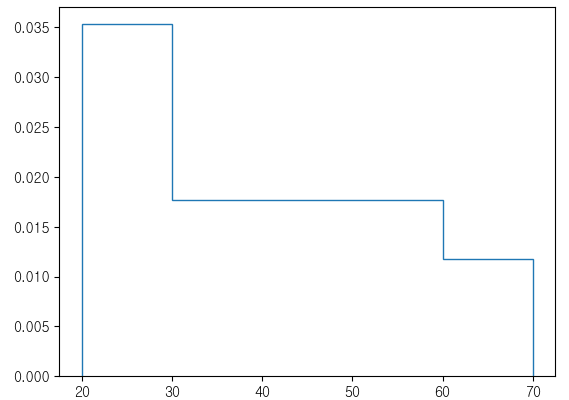 plt.hist(ages,bins=bins,density=True,histtype='step')