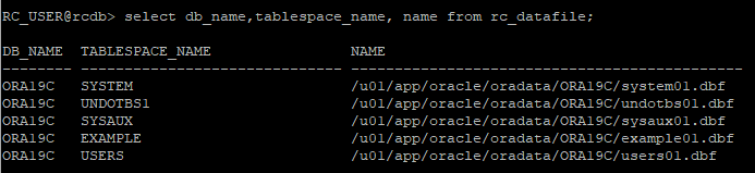 select db_name,tablespace_name, name from rc_datafile;