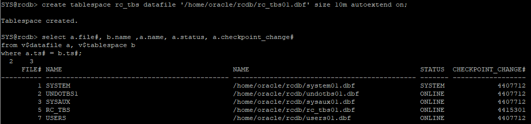 create tablespace rc_tbs datafile '/home/oracle/rcdb/rc_tbs01.dbf' size 10m autoextend on;