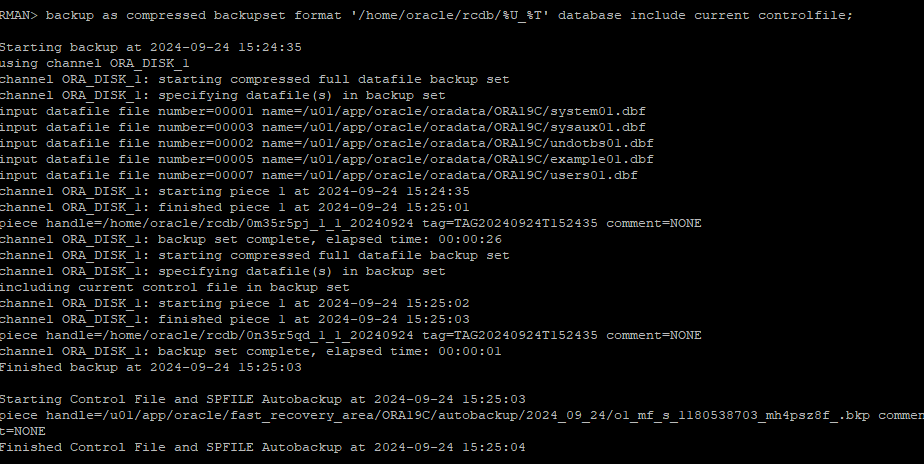 backup as compressed backupset format '/home/oracle/rcdb/%U_%T' database include current controlfile;