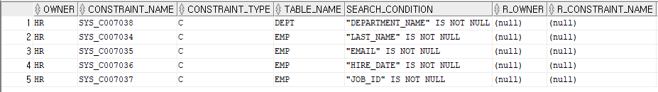 SELECT * FROM user_constraints WHERE table_name IN ('EMP','DEPT');