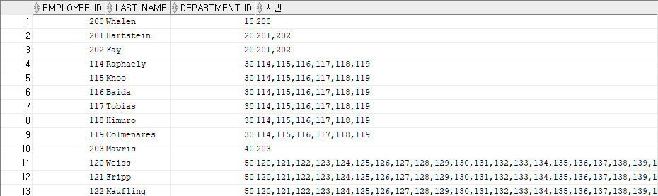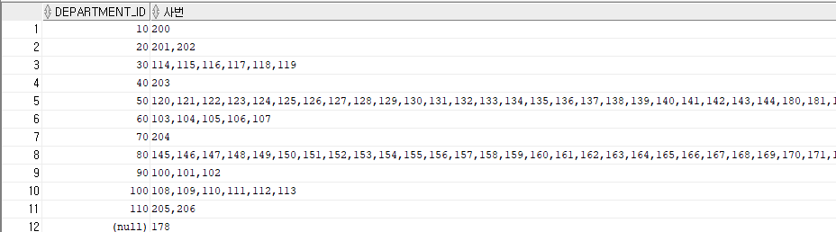 listagg(employee_id, ',')within group(order by employee_id) over(partition by department_id) as 사번