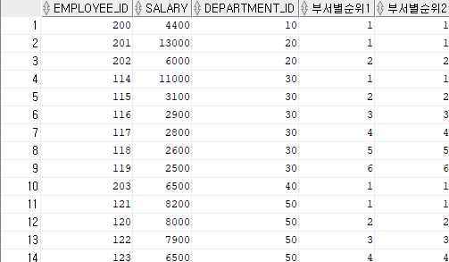 rank() over (partition by department_id order by salary desc) as 부서별순위1,