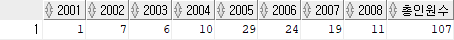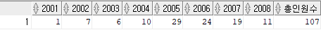 PIVOT (count(*) for year in (2001,2002,2003,2004,2005,2006,2007,2008))