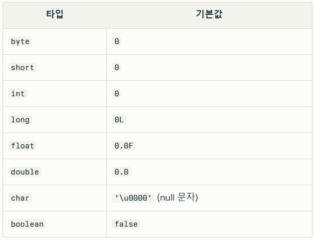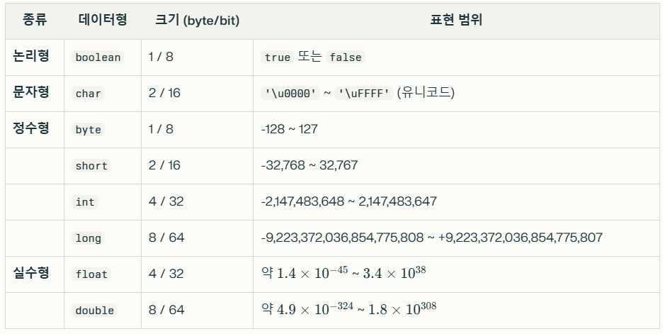 Java에서 원시 타입은 아래와 같은 8가지의 타입으로 구성됩니다.