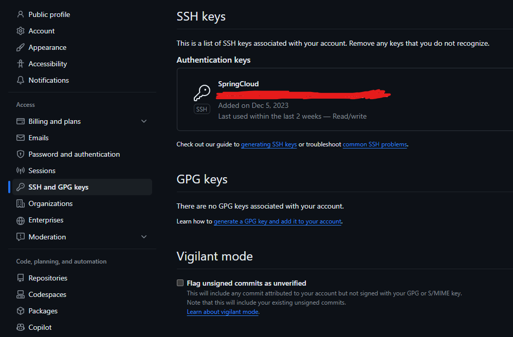 하지만 문제가 있다. 일반적으로 미치지 않고서야 민감한 정보들을 public 레포로 생성하지 않을 것이다. 하지만 외부 Config 서버는 private 레포를 참조해야 한다. 콘피그 서버가 깃 저장소를 참조할 때는 대칭키를 사용해야 한다고 한다. 대칭키를 만들고 이를 github deploy key 혹은 ssh key로 등록해야 한다. 필자는 ssh를 통해 콘피그 레포를 참조할 것이기에 ssh key로 하겠다. (참고한 포스터는 deploy key로 진행하는데, 개인의 ssh key보다 프로젝트 단위의 deploy key가 옳은 방식인 것 같다. 조만간 이 방식으로 바꿀 듯 하다). 대칭키를 생성하는 과정은 생략하겠다. .pub에 담긴 공개키를 아래처럼 개인 설정에서 추가해준다.